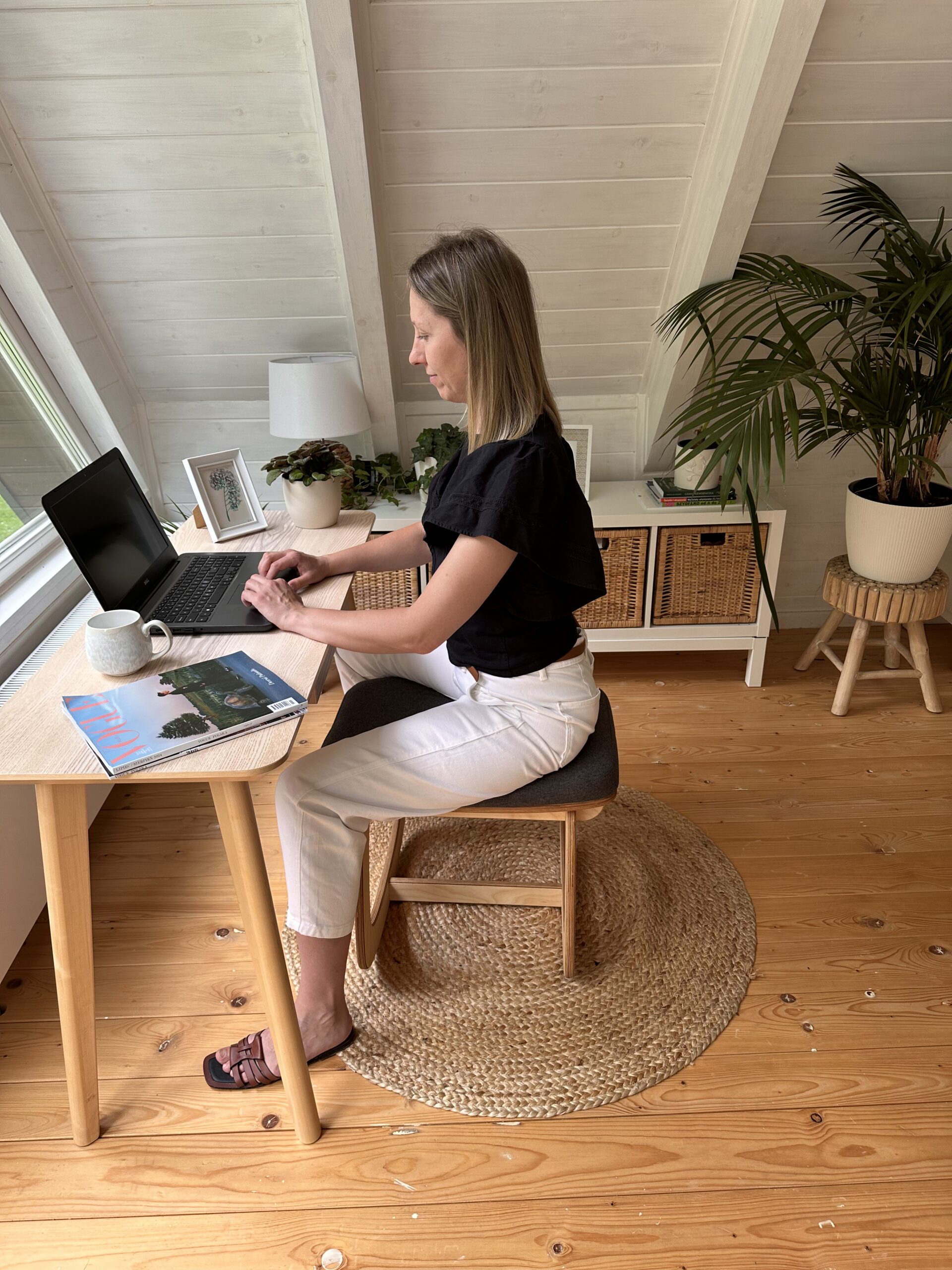 Brak oparcia połączony z ruchem naturalnie prostuje plecy.